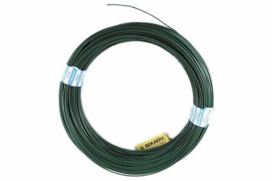 Binddraad van het merk Betafence dat gemaakt is van metaal, het omhulsen heeft de kleur groen. Dit 100 meter lange draad wordt geleverd in een rol.