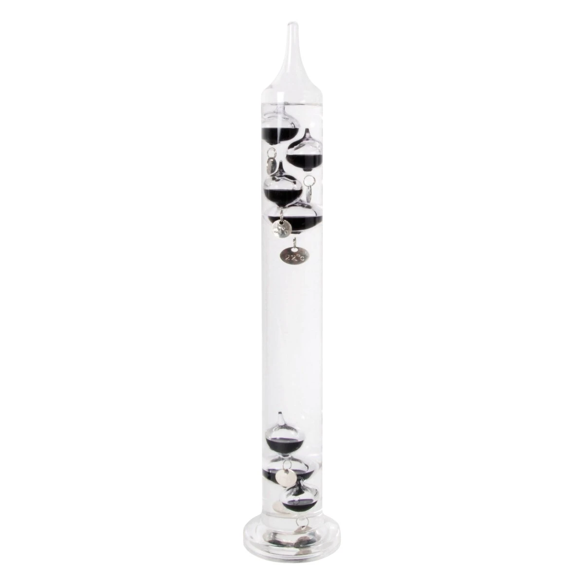 Zoekend naar een manier om exact temperaturen te meten, ontdekte Galileo deze fascinerende methode. Hij plaatste meerdere exact uitgemeten ballen in een cylinder gevuld met een bepaalde vloeistof. Hij ontdekte dat de ballen stegen of daalden afhankelijk van de aanwezige temperatuur. Met deze methode, was hij in staat om de exacte temperatuur vast te stellen. Wanneer de temperatuur stijgt wordt de vloeistof in de glazen cylinder minder dicht en zinken de zwaardere ballen langzaam naar de bodem. Deze glazen thermometer kan dankzij de voet stabiel op elke plek geplaatst worden. De schaal van de thermometer wordt in Celsius als in Fahrenheit weergegeven dankzij een metalen plaatje onder iedere glazenbolletje.
