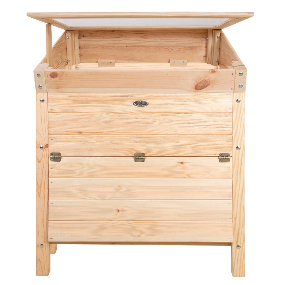 Deze verhoogde houten kweektafel met opslag is geschikt voor in de tuin of jouw balkon. De kweekbak is gemakkelijk te onderhouden en komt inclusief worteldoek. De kweekbak is gemaakt van FSC gecertificeerd vurenhout. De metalen delen zijn gemaakt van RVS. De deksel is een los onderdeel van deze set. Deze koude bak beschermd jouw planten en verlengd het seizoen. De deksel kan ook direct op de grond worden geplaatst in plaats van op de verhoogde kweekbak. De deksel komt met een polycarbonaat raam die zorgt dat de planten niet verbranden.Â