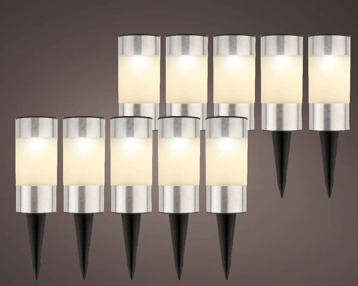 Deze solar staande tuinlampen werken met een zonnepaneel. Deze set bestaat uit een 10 tal tuinlampen met ieder een solar paneel.